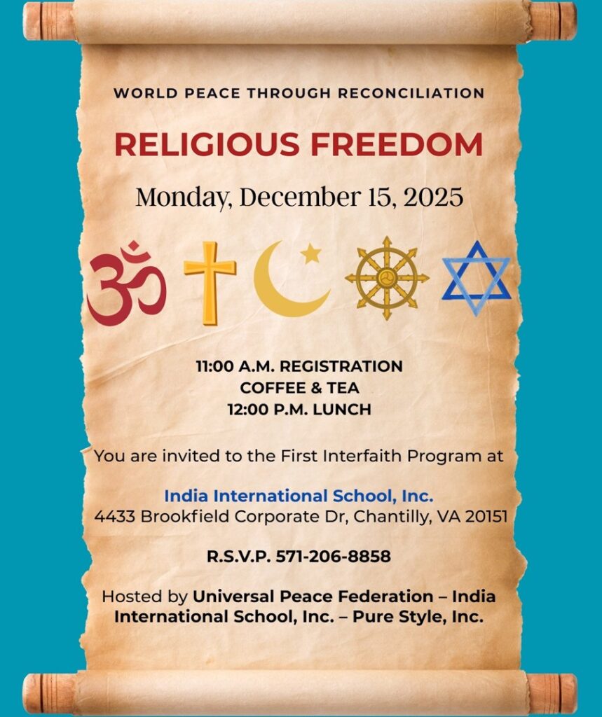 A warm spirit of fellowship, cultural appreciation, and shared commitment to peace filled the room on December 15, as community leaders and guests gathered for the First Interfaith Program on Religious Freedom at the India International School in Chantilly, Virginia.